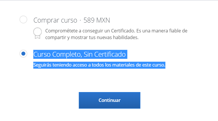 Es importante que sepas que para obtener acceso al curso de manera gratuita debes seleccionar la opcion de auditar curso. Puedes usar la siguiente imagen como referencia: